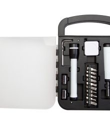 SET DE HERRAMIENTAS DE 19 PIEZAS, TAMAÑO: 22 X 16 X 2,5 CM. CONTIENE: LINTERNA, CINTA METRICA, MULTI DESARMADOR CON JUEGO DE 10 PUNTAS 4 PHILLIPS, 2 PLANAS, 3 HEXAGONALES Y 1 ADAPTADOR PARA ACOPLE. ACOPLE PARA LLAVE TUBO 7, 8 , 9 Y 10 MM Y LLAVE ALLEN.